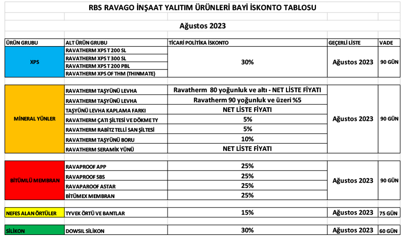 Değerli İş Ortağımız, RBS Ravago Ürün Gruplarımızda 31 TEMMUZ 2023 PAZARTESİ gününden itibaren geçerli güncel AĞUSTOS AYI Ticari politikamız ektedir. Ürün ve hizmet kalitemizden taviz vermeden, sizlere mümkün olan en uygun koşullarla servis vermeye devam edeceğimizi bilgilerinize sunarız.
